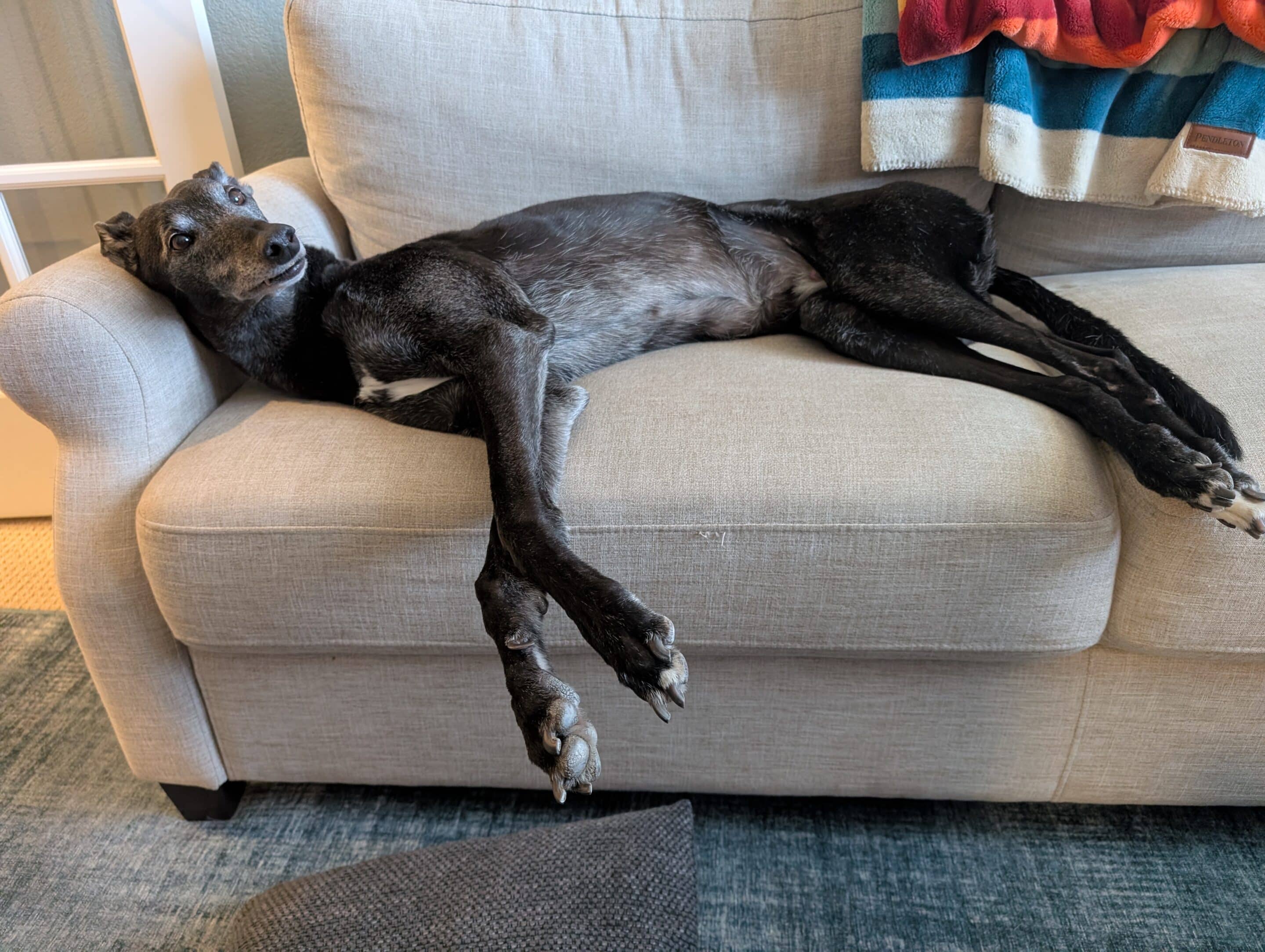 Freyja was grace in motion and stillness. A calm, steady soul with a quiet dignity that touched everyone who met her. She came into our lives in 2015 as a retired racer — Get Real Christa from Florida — shortly before we moved to Colorado and had been part of every chapter since. Always present, always near. She wasn’t the kind to demand attention, but her presence filled a room. Her watchful eyes, gentle spirit, and silent companionship were the quiet heart of our home.